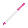 Bolígrafo 2 en 1 con marca textos; barril plástico color blanco, tapa en la parte superior translucida con detalles de color en clip y punta. Tinta de escritura negra.