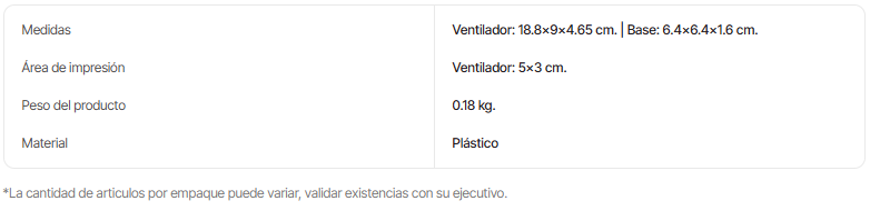 Mantente fresco en cualquier lugar con este ventilador portátil de plástico con base. Su diseño compacto y liviano permite transportarlo fácilmente, mientras que su base estable ofrece mayor comodidad y seguridad durante su uso. Ideal para escritorios, mesas de noche o viajes. Fabricado en plástico resistente, es duradero y fácil de limpiar, transportar y almacenar. Su funcionamiento eficiente lo convierte en el compañero perfecto para los días calurosos, sin importar dónde estés.